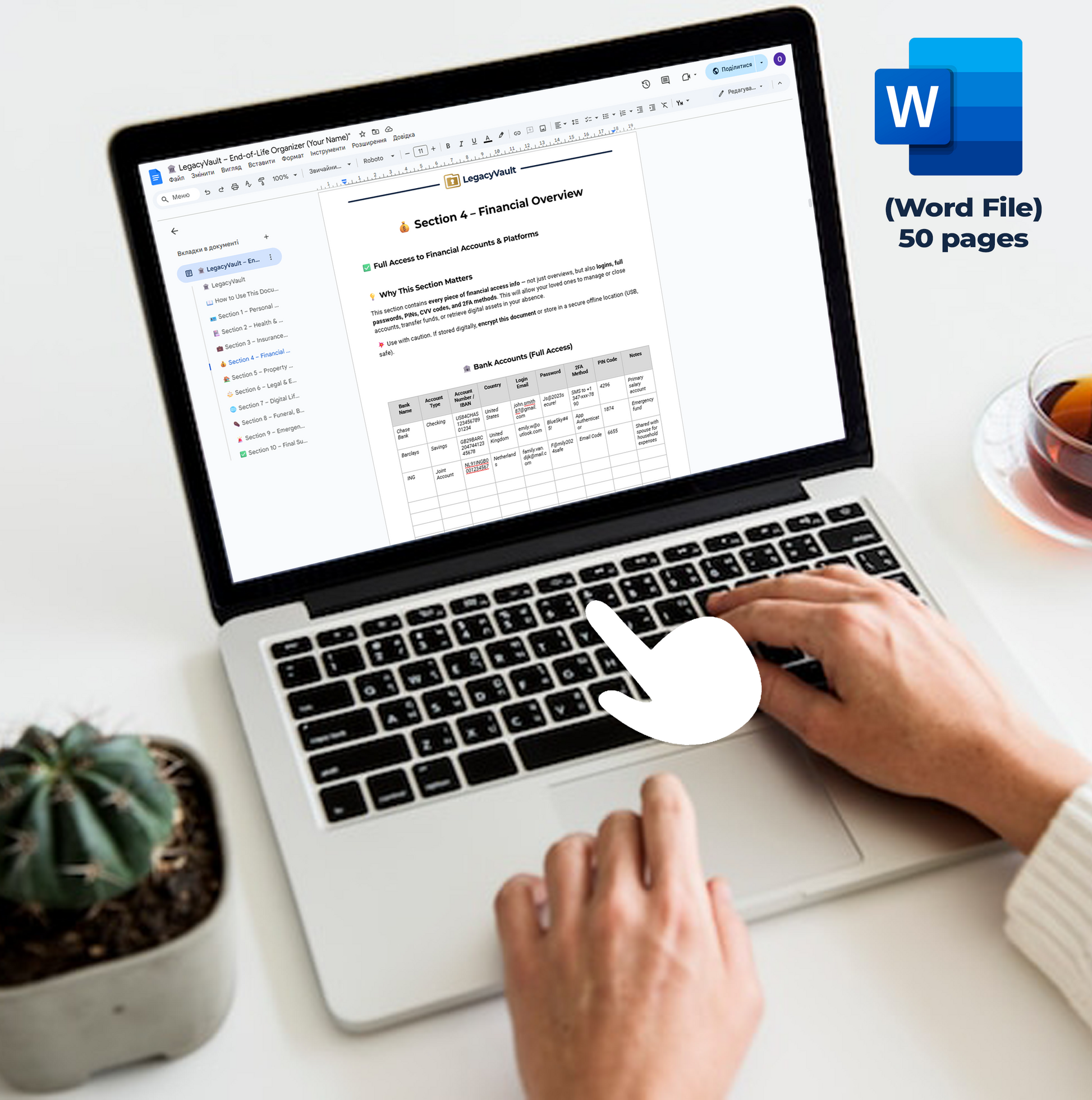 LegacyVault is a simple digital Word file that gathers all your essential information — contacts, documents, passwords, accounts, and plans — in one organized space.